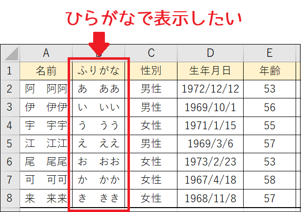 ふりがなを「ひらがな」で表示する方法を、よくご質問いただくので、関数ネスト(入れ子)①の練習問題のデータを使って解説していきたいと思います。