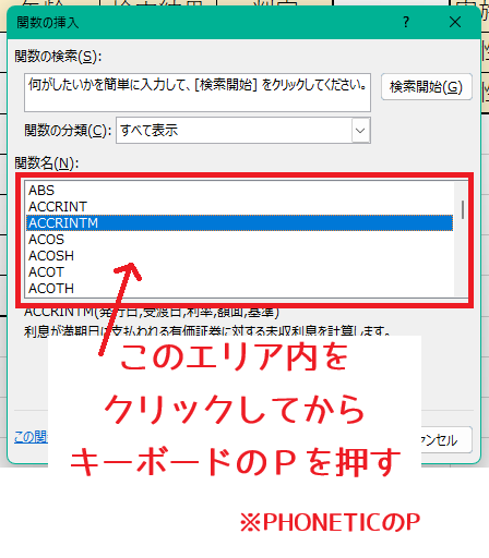 関数名が表示されたエリア内をクリックして、「PHONETIC関数」の頭文字「P」を入力すると