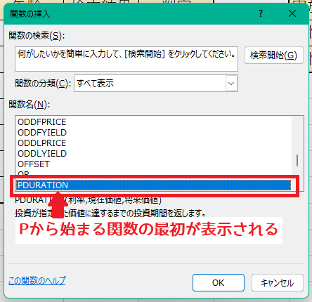検索する時は、関数の分類のプルダウンをクリックして、下記の画像のように「すべて表示」を選びます。